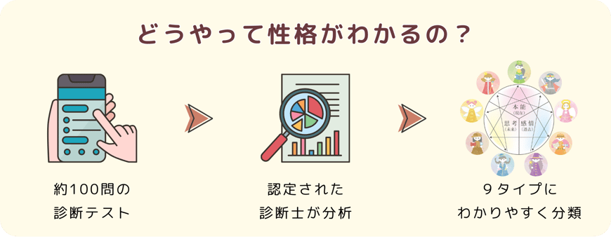 ただし、本診断はエニアグラムをベースにした新しい診断ですので、結果がエニアグラムと異なる場合もありますことをご承知おきください。